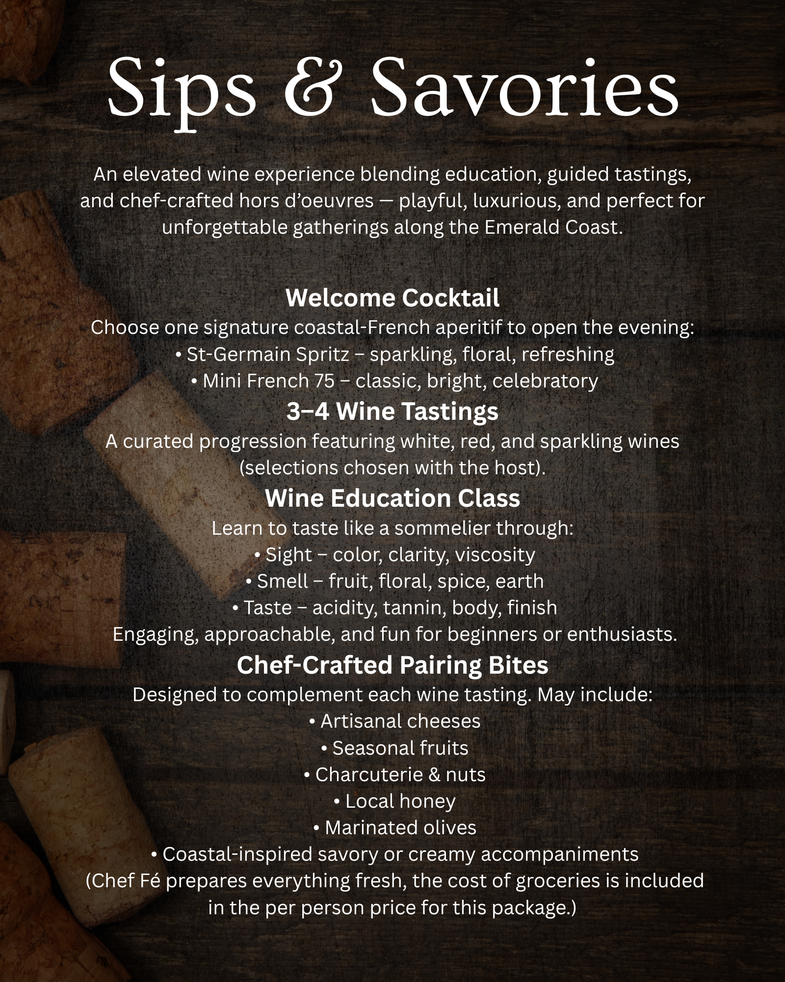An elevated wine experience blending education, tasting, and chef-crafted hors d’oeuvres.